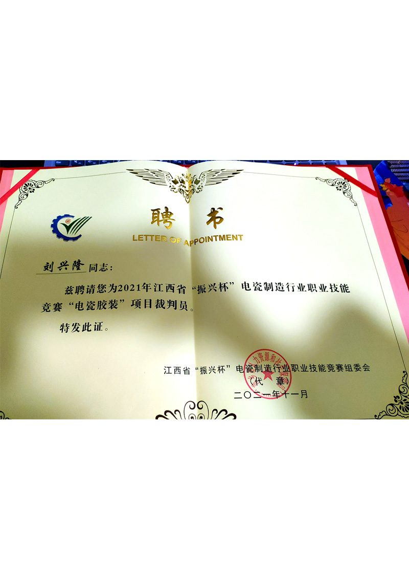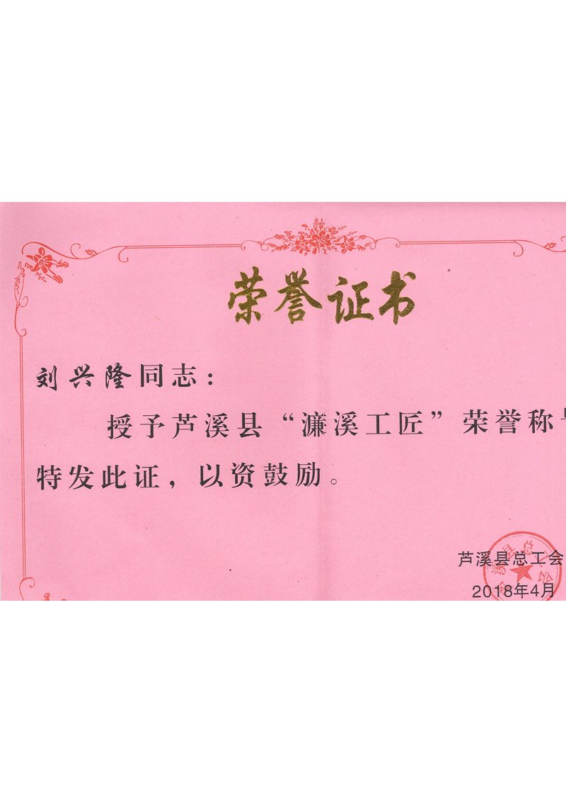 “濂溪工匠”荣誉证书